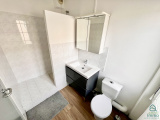 - Une salle d'eau composée d'une douche entièrement carrelée, d'un meuble vasque avec miroir, d'un wc, d'une poubelle, d'un tapis de douche