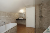 Salle de bain d'exception avec douche italienne XXL, baignoire, lavabo et accès balcon.