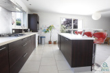 Vaste pièce de vie lumineuse comprenant une cuisine ouverte, un espace repas convivial et un salon chaleureux.
