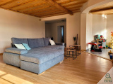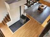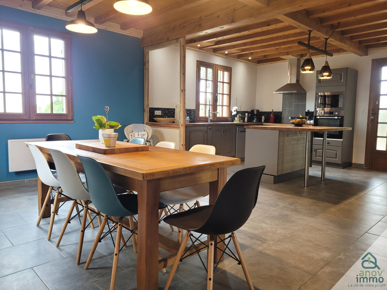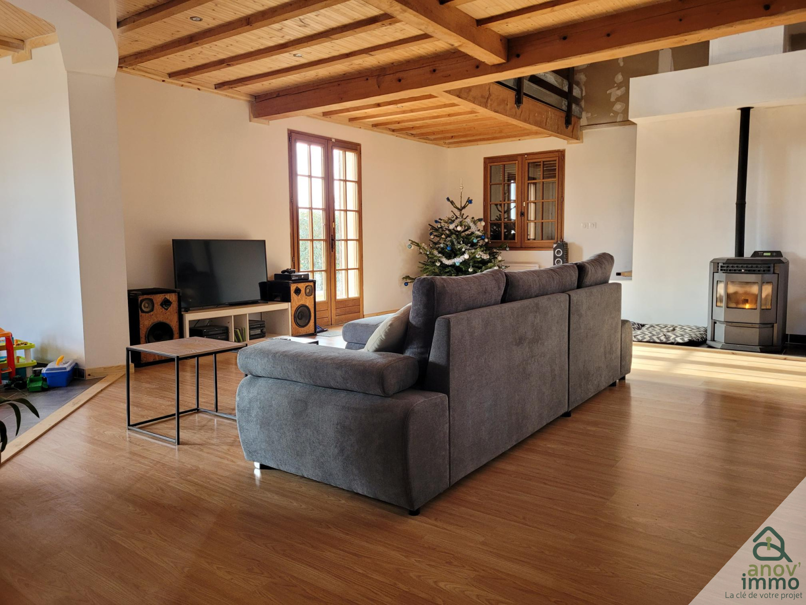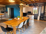 Une GRANDE cuisine équipée ouverte sur la pièce de vie de 42 m² avec son poêle à granule et un espace détente ou salle de jeux pour les enfants.