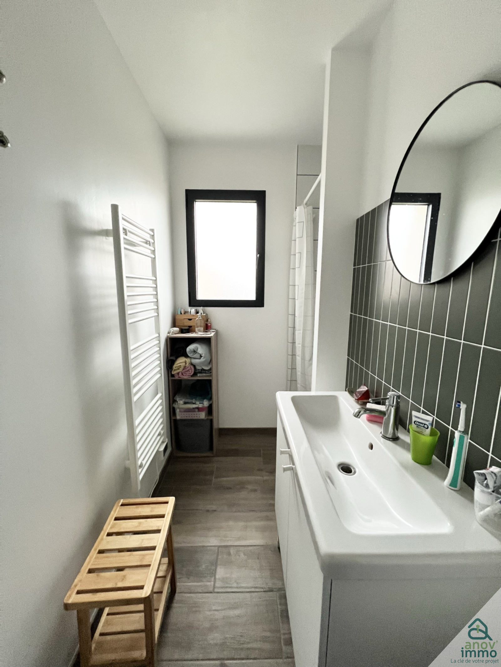 - Une SALLE D'EAU comprenant une douche, une grande vasque, un miroir, un sèche serviettes,