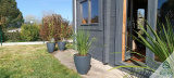 En extérieur, une petite terrasse donnant sur le jardin arboré.