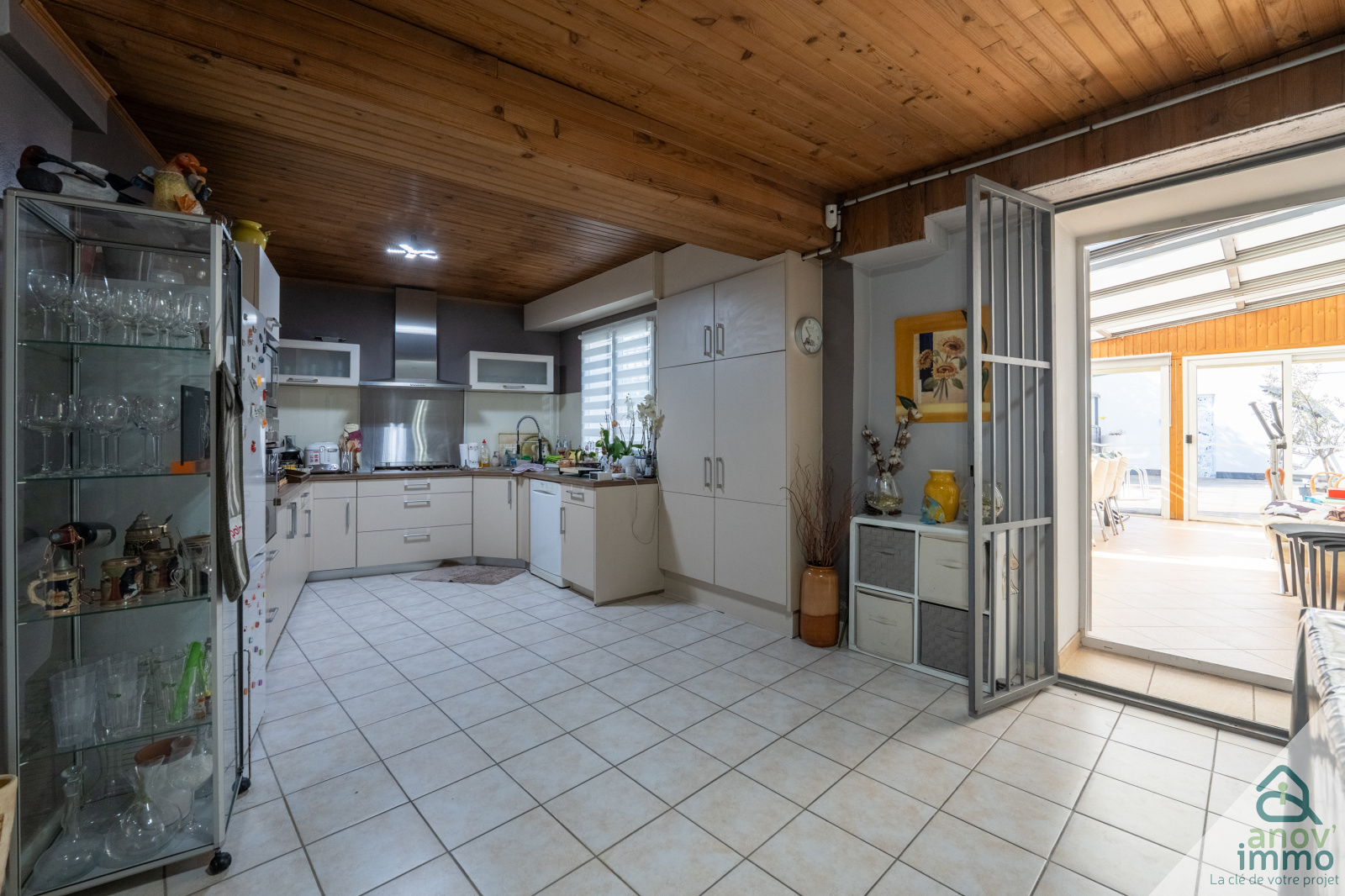 Elle se compose au rez de chaussée d'une entrée, d'une chambre, d'une cuisine d'été, d'une salle d'eau, d'une véranda donnant sur un magnifique terrain paysagé avec une belle terrasse bois et une pisicine creusée. Un garage de 30m2, une annexe et une cave complètent ce niveau.