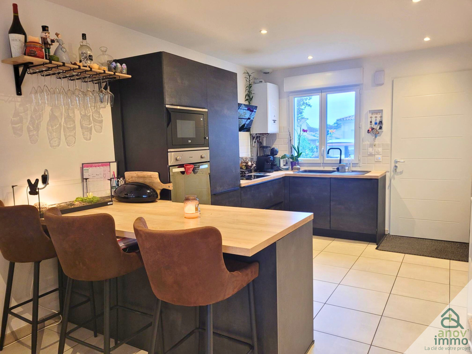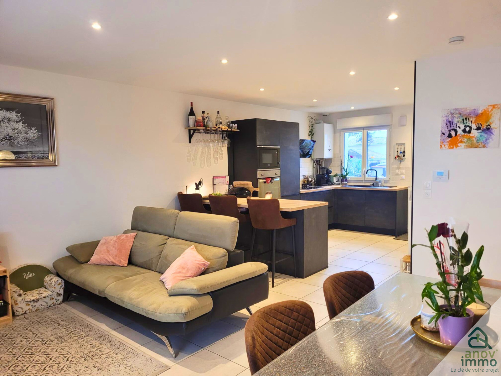 Au rez-de-chaussée, une cuisine équipée ouverte sur la pièce de vie de 34 m², un garage et un toilette.