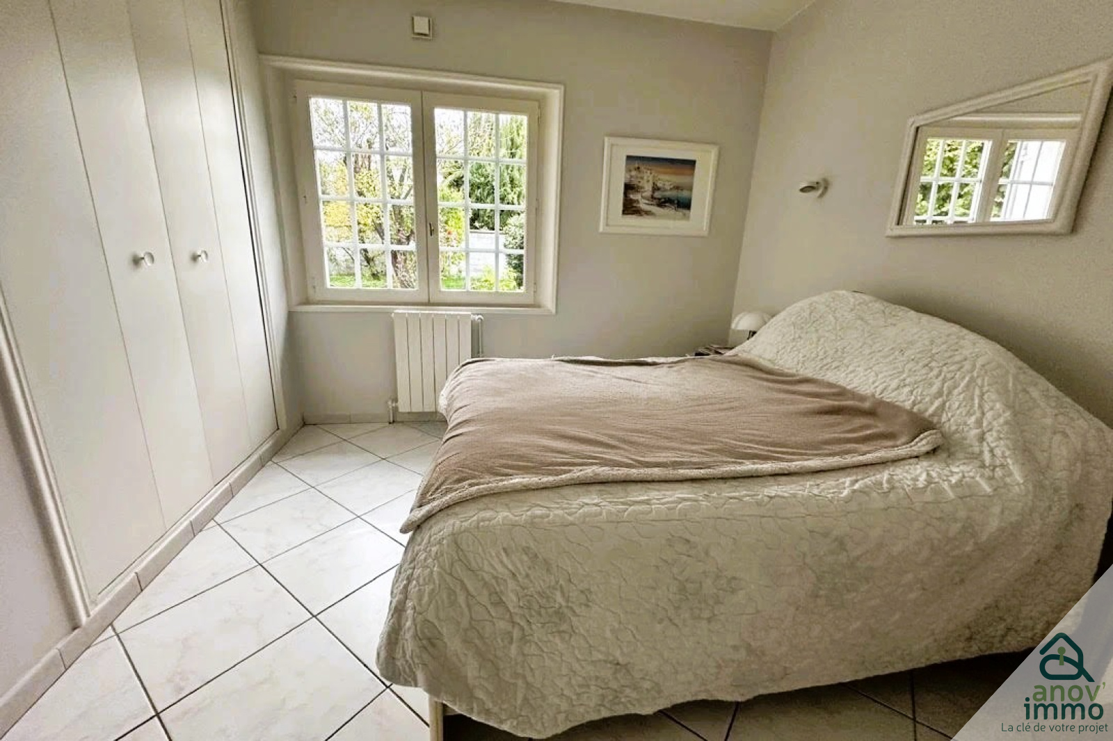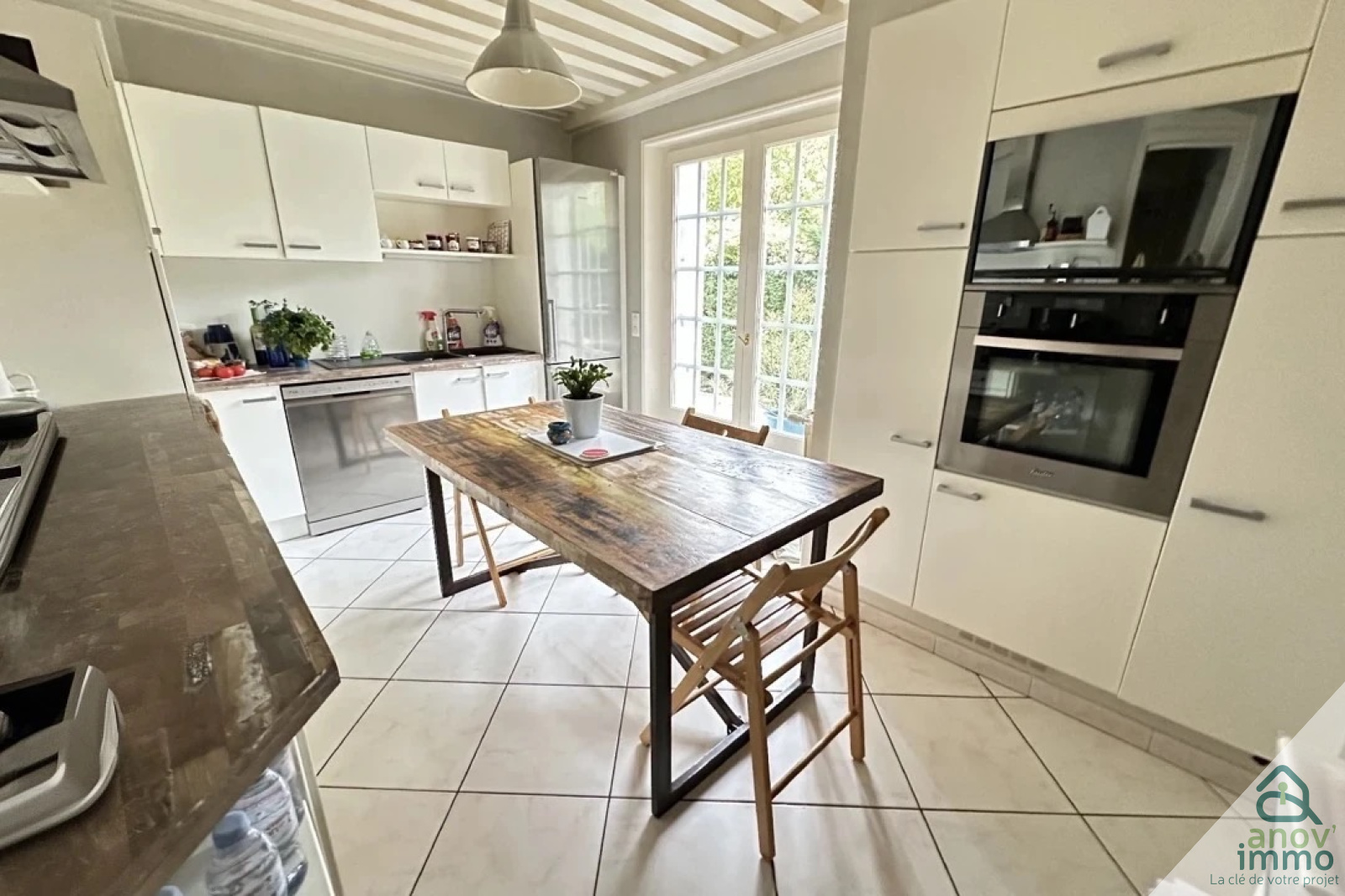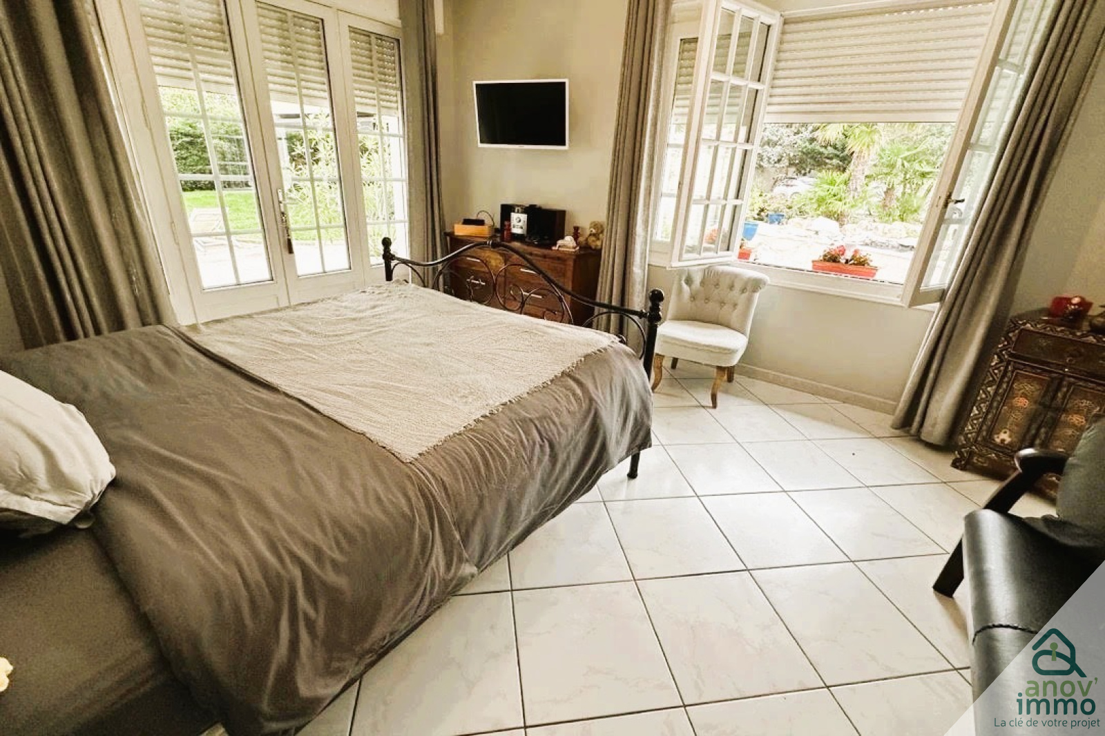 Le rez-de-chaussée comprend une belle pièce à vivre de 36 m² avec cheminée insert et 3 baies vitrées avec stores bannes ouvrent sur le jardin, une cuisine bien équipée avec passe-plat sur le séjour, une chambre avec placard mural de 11 m², une salle de bains et une buanderie. Pour plus de confort, sur l’autre aile de la maison, une belle suite parentale privative avec une chambre très lumineuse de 17 m², un dressing de 11 m², une salle de bains avec baignoire d’angle, un hammam, un grand bureau ou chambre supplémentaire de 29 m² et un wc.