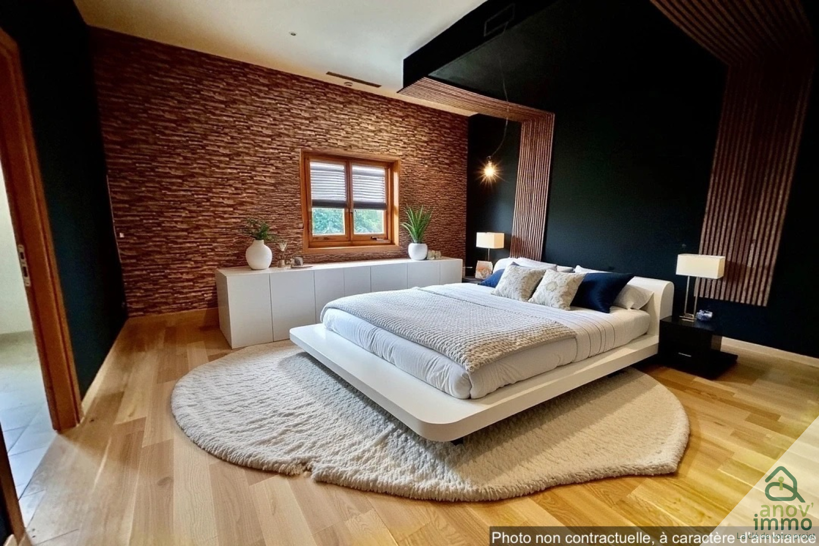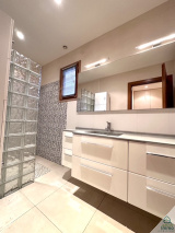 Prestations de qualité : plancher chauffant et rafraîchissant par géothermie avec réglage par pièce, isolation des murs intérieure et extérieure, volets roulants électriques, éclairages avec variateurs, escalier, portes et placards muraux en bois massif. Cuisine équipée avec nombreux rangements, four classique, four vapeur et micro-ondes, table à induction et friteuse intégrée dans l'ilot central.