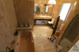 La maison principale offre un bel espace de vie lumineux de 75 m² avec cheminée, une cuisine équipée, deux chambres au rez-de-chaussée (dont une avec salle de bains), ainsi qu’une chambre à l’étage avec salle de bain et balcon, offrant une vue dégagée sur la nature.
