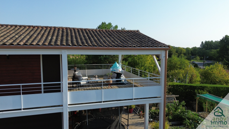 À l’étage, l’espace nuit comprend une mezzanine lumineuse ouvrant sur un grand balcon, des chambres confortables, une salle de bains et des WC indépendants.