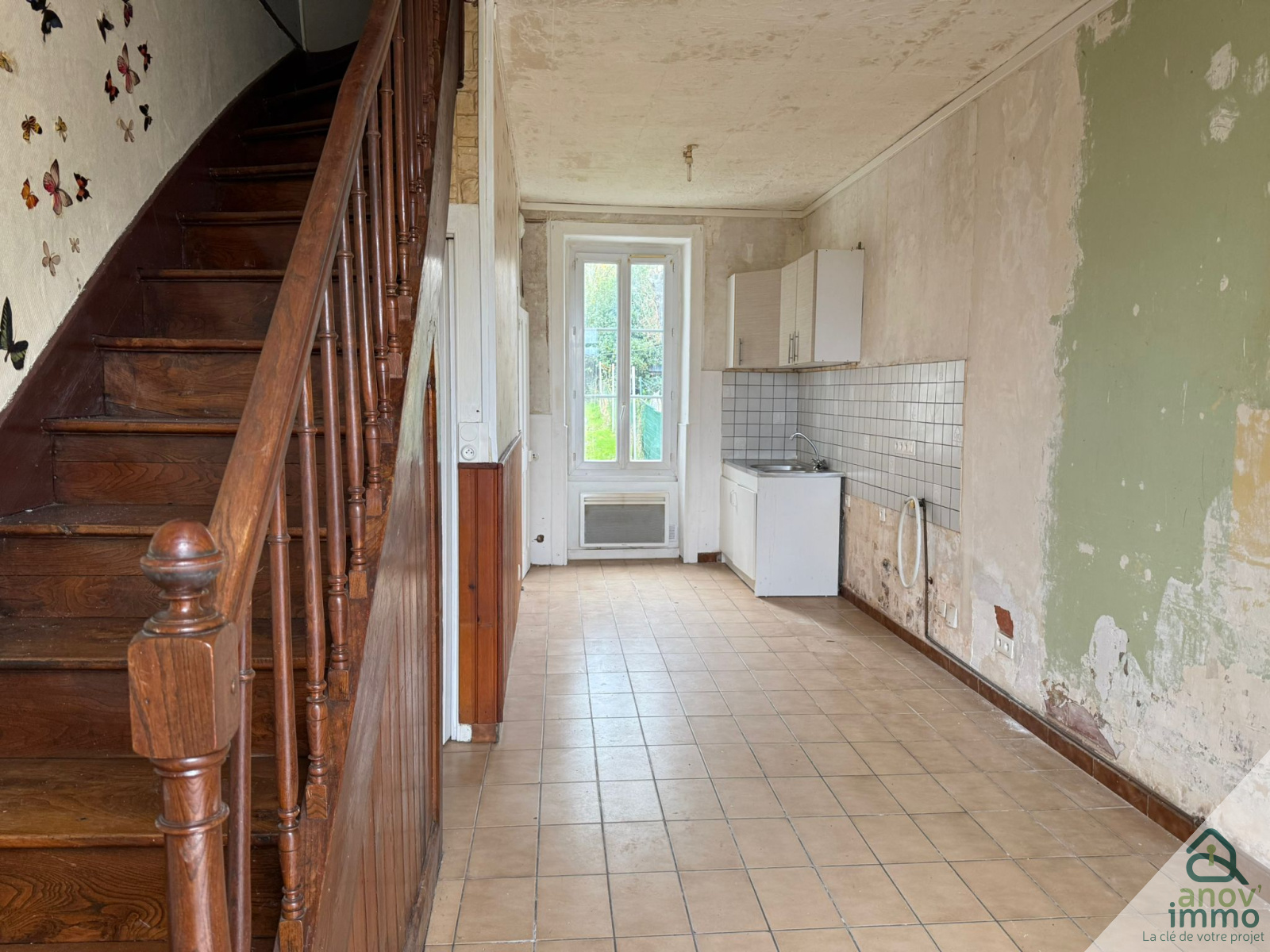 Au rez-de-chaussée : une pièce de vie avec cuisine ouverte, une salle d’eau et un WC.